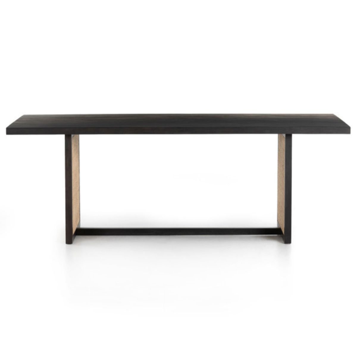 Elevate your dining space with this stunning modern black Clara Solid Wood Rattan Dining Table. Featuring a sleek rectangular black tabletop and unique natural woven rattan panels on the base, this table seamlessly blends contemporary design with a touch of natural elegance. Perfect for family meals or entertaining guests, its spacious surface accommodates comfortable seating for gatherings. Crafted for durability and style, this dining table is ideal for anyone seeking a chic and functional centerpiece for their dining room or kitchen. Explore our collection of modern dining tables, black dining tables, rattan furniture, and rectangular dining tables to complete your home’s aesthetic.