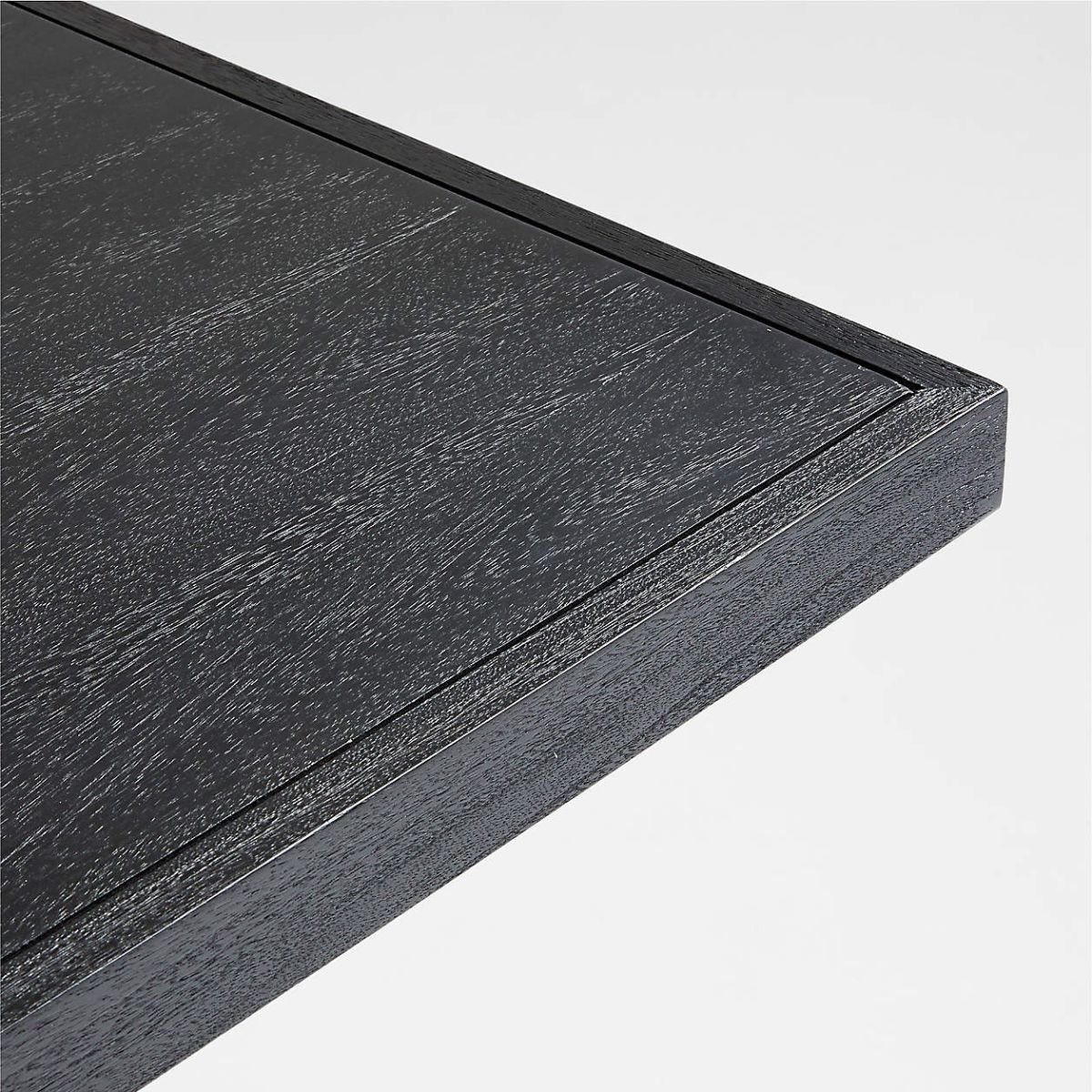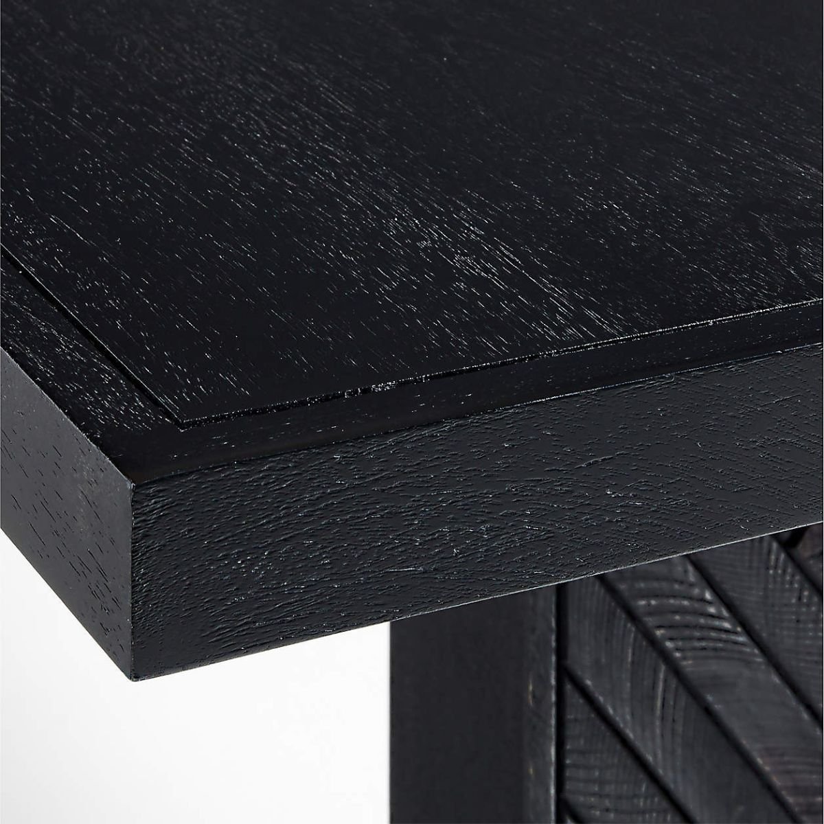 Using traditional parquetry techniques, skilled woodworkers add artisan rusticity to our clean, contemporary Duke Solid Wood Black 8-Seater Dining Table. Bringing geometric complexity to the table’s slab legs, each piece of solid wood is carefully cut and inlaid by hand to create a modern mosaic of angled lines. Wire brushing and an ebonized finish give the table a bold and rustic look.