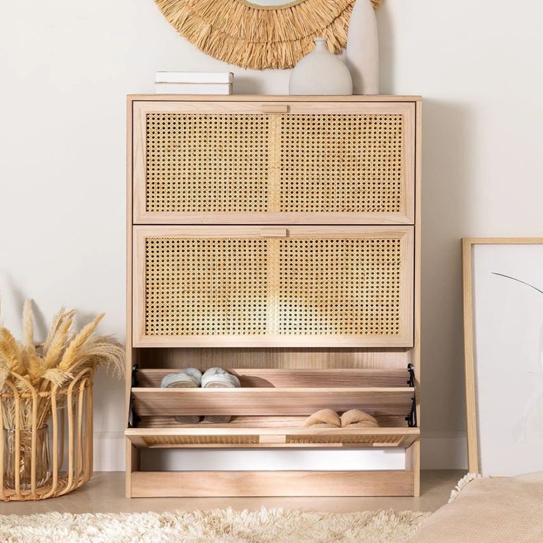 In summary, Emma Solid Wood Rattan Shoe Cabinet is a functional and stylish piece of furniture designed to keep shoes organized and enhance the aesthetics of a living space. It offers a wide range of options in terms of material, size, style, and features to cater to various tastes and storage needs.