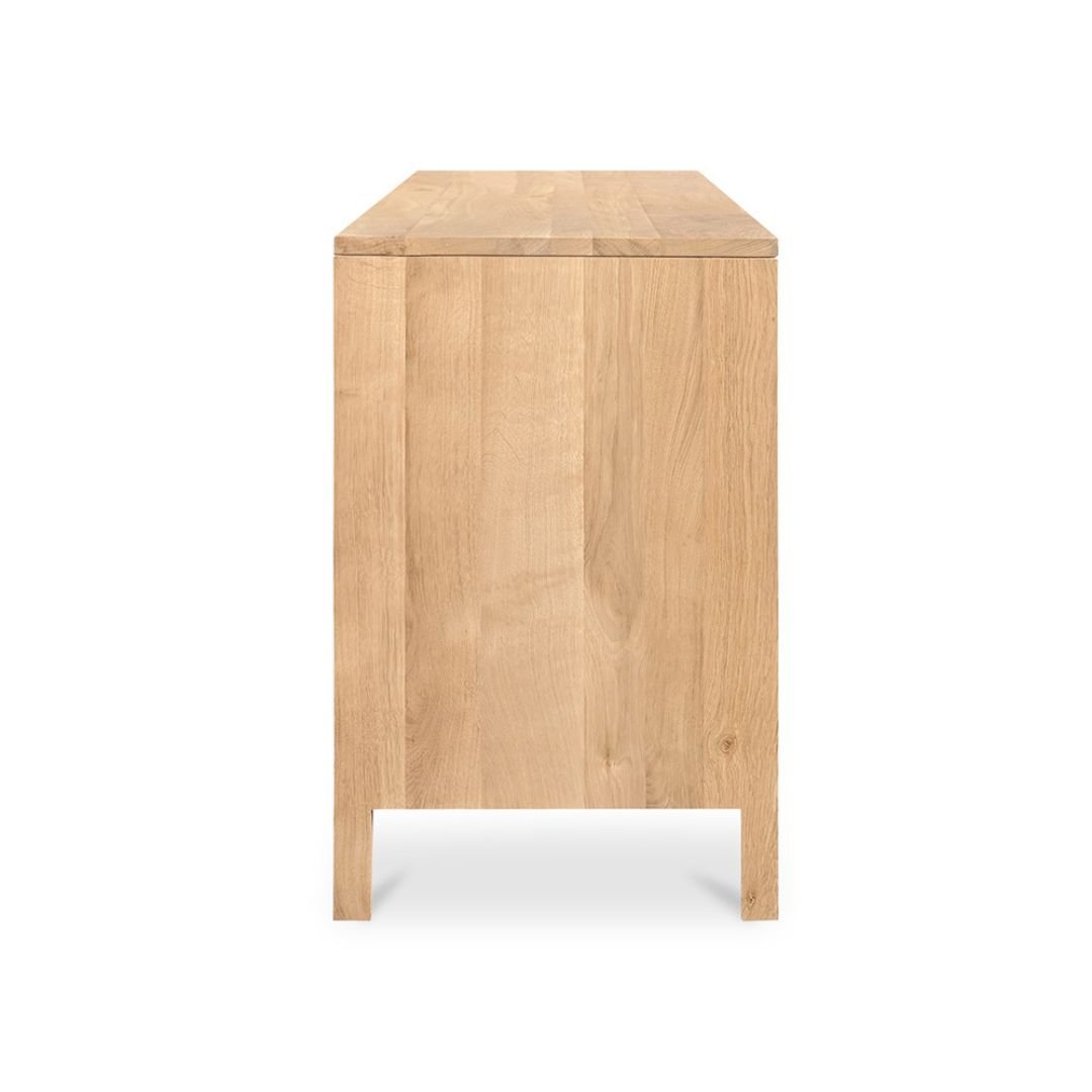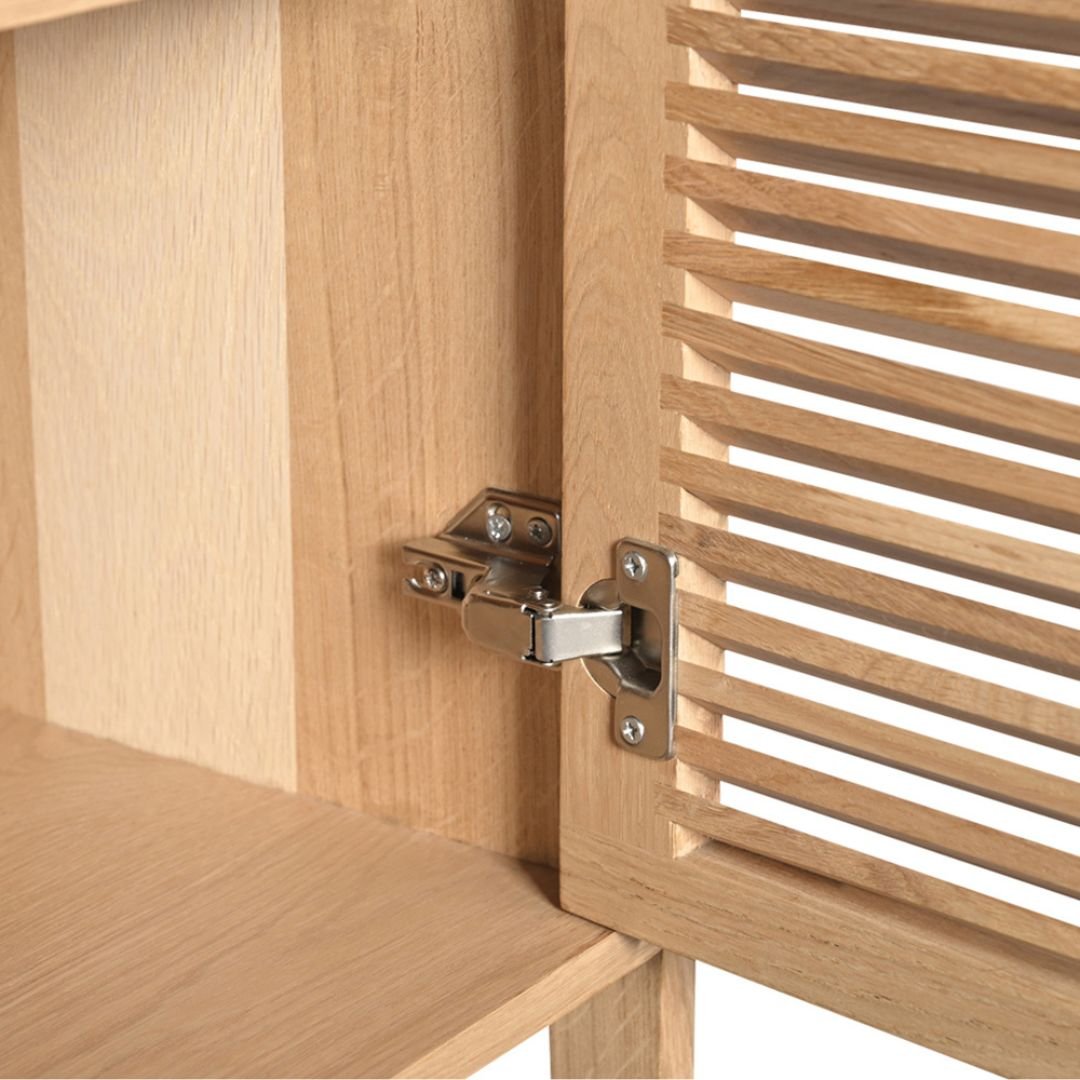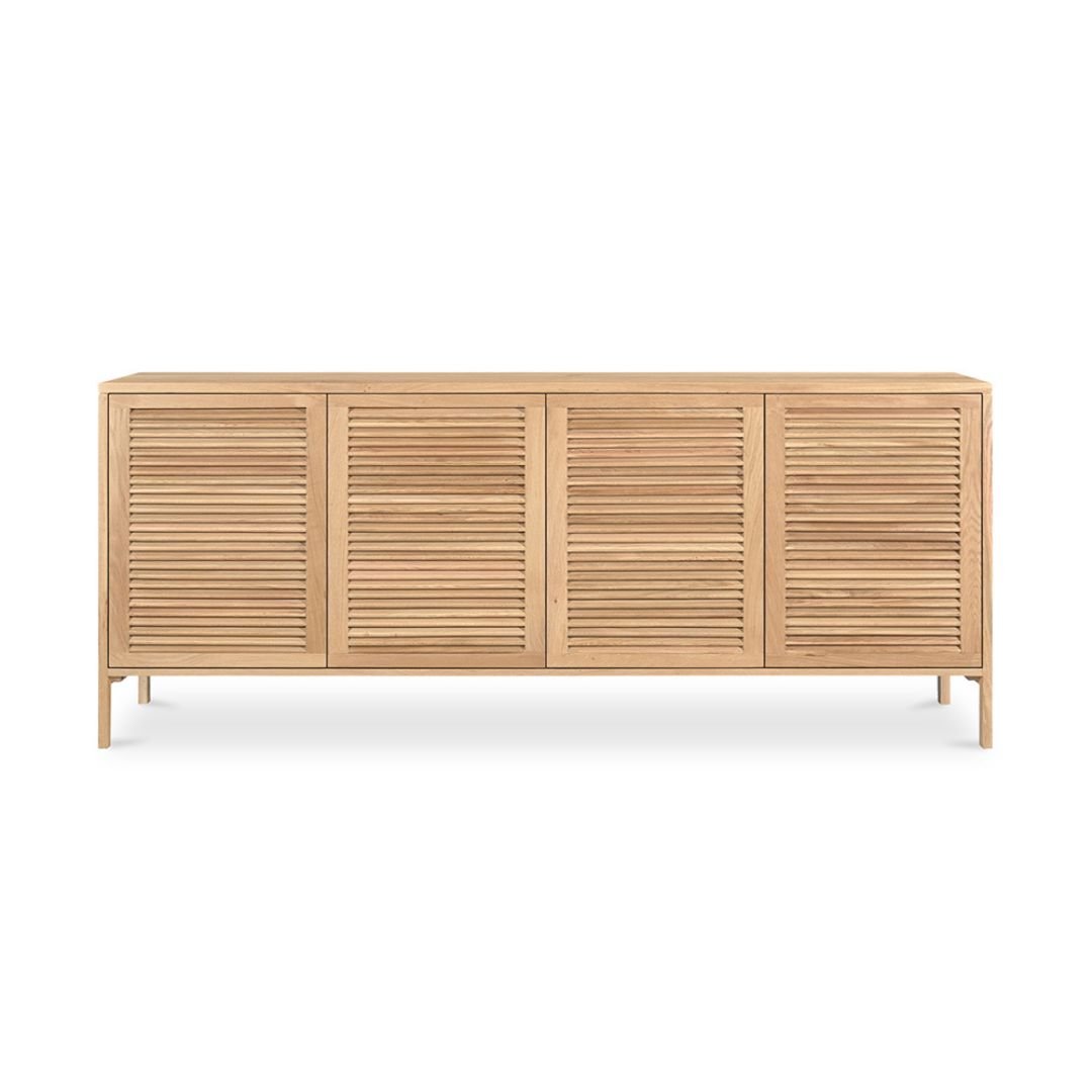 Inspired by the jalousie windows of Florida, the Enna Solid Wood 4-Door Sideboard’s shutter-like façade where the aroma of the free clever arrangement of slats creates an exquisite play of light and shadow, a stunning visual element that adds depth and texture to any space. Crafted from solid wood, the sideboard exudes timelessness while providing ample storage.