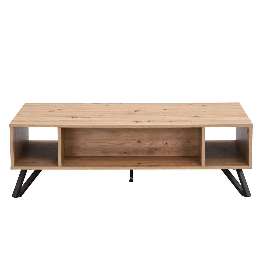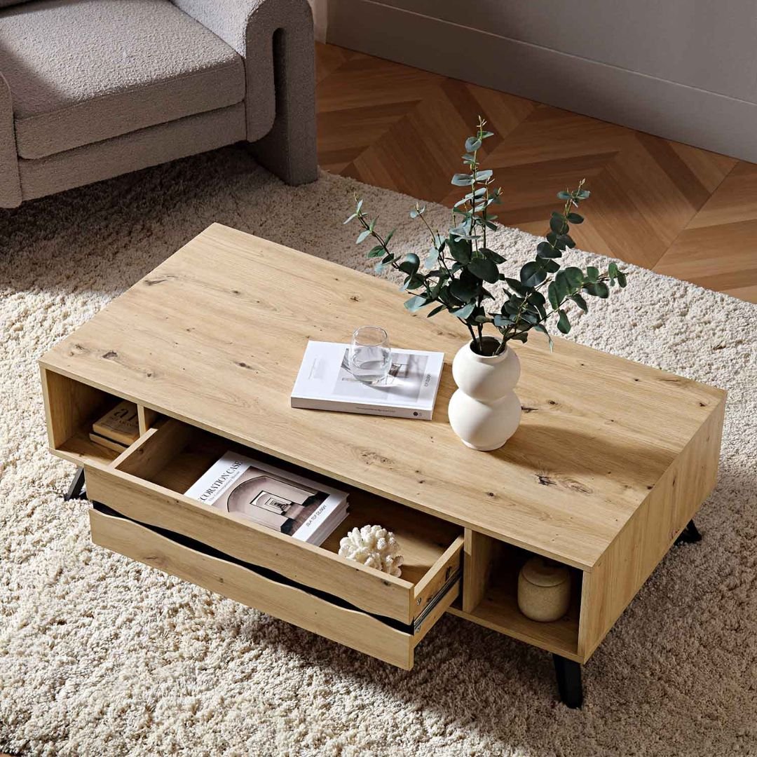 The perfect centre piece addition to your living space, Oak Effect Coffee Table is further enhanced with solid steel legs in a geometric design, as well as a simple curved design on the drawer.
