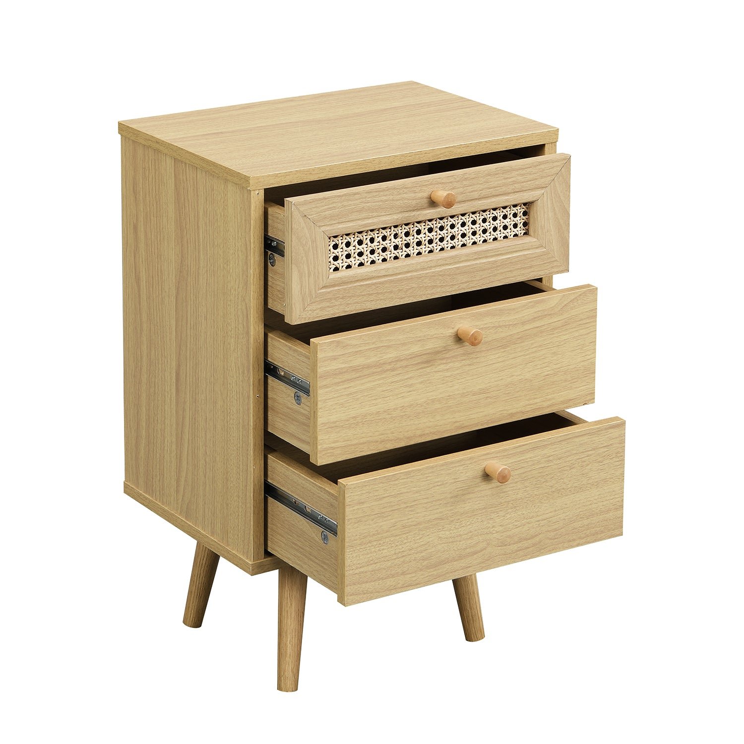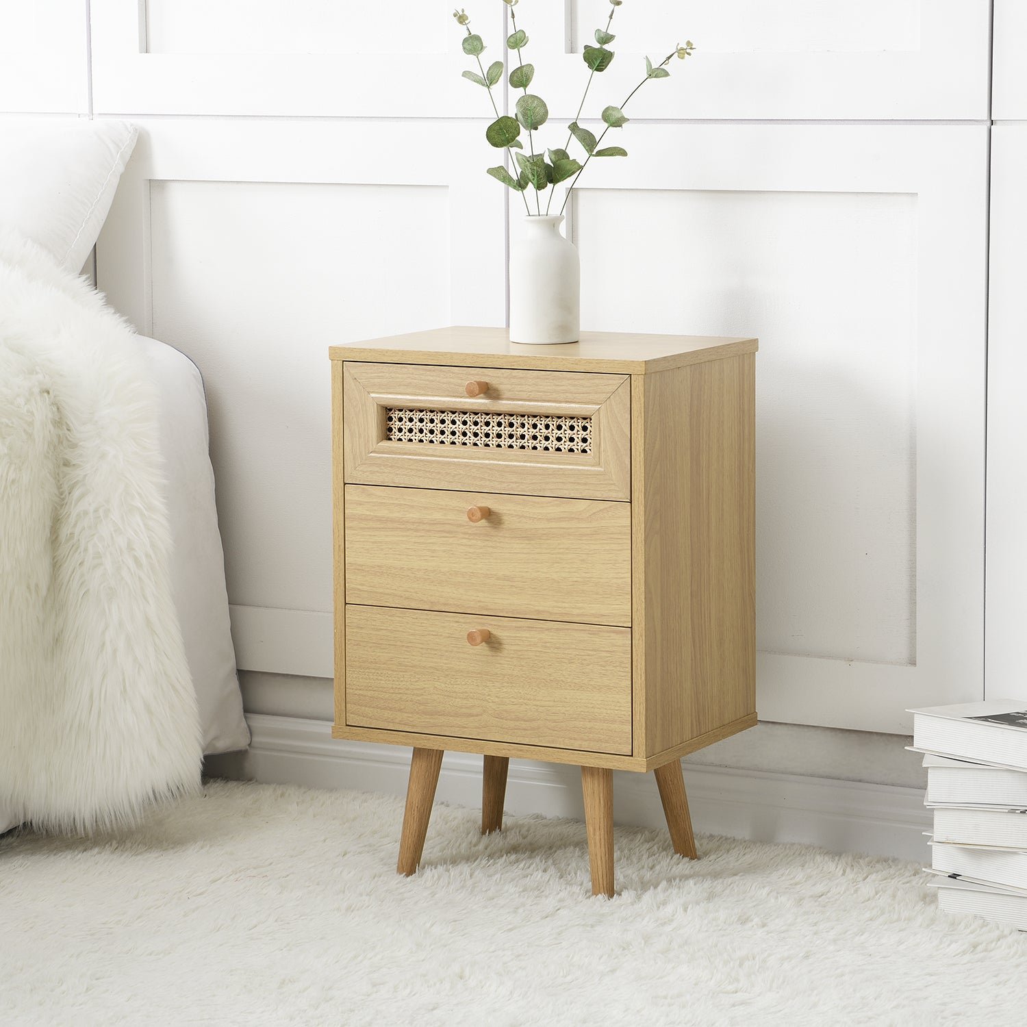 - Our France Rattan 3-Drawer Bedside Table is designed with beautiful natural woven rattan drawer door and solid wood drawer handles.