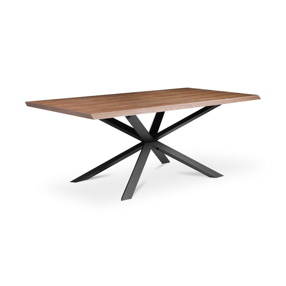 A sleek criss-cross base design matches with a walnut surface to create a contemporary dining table like no other.