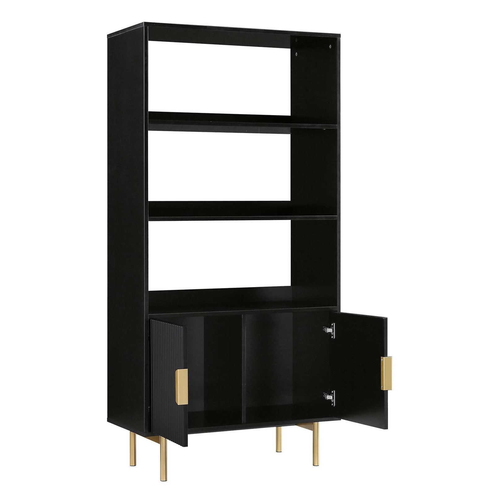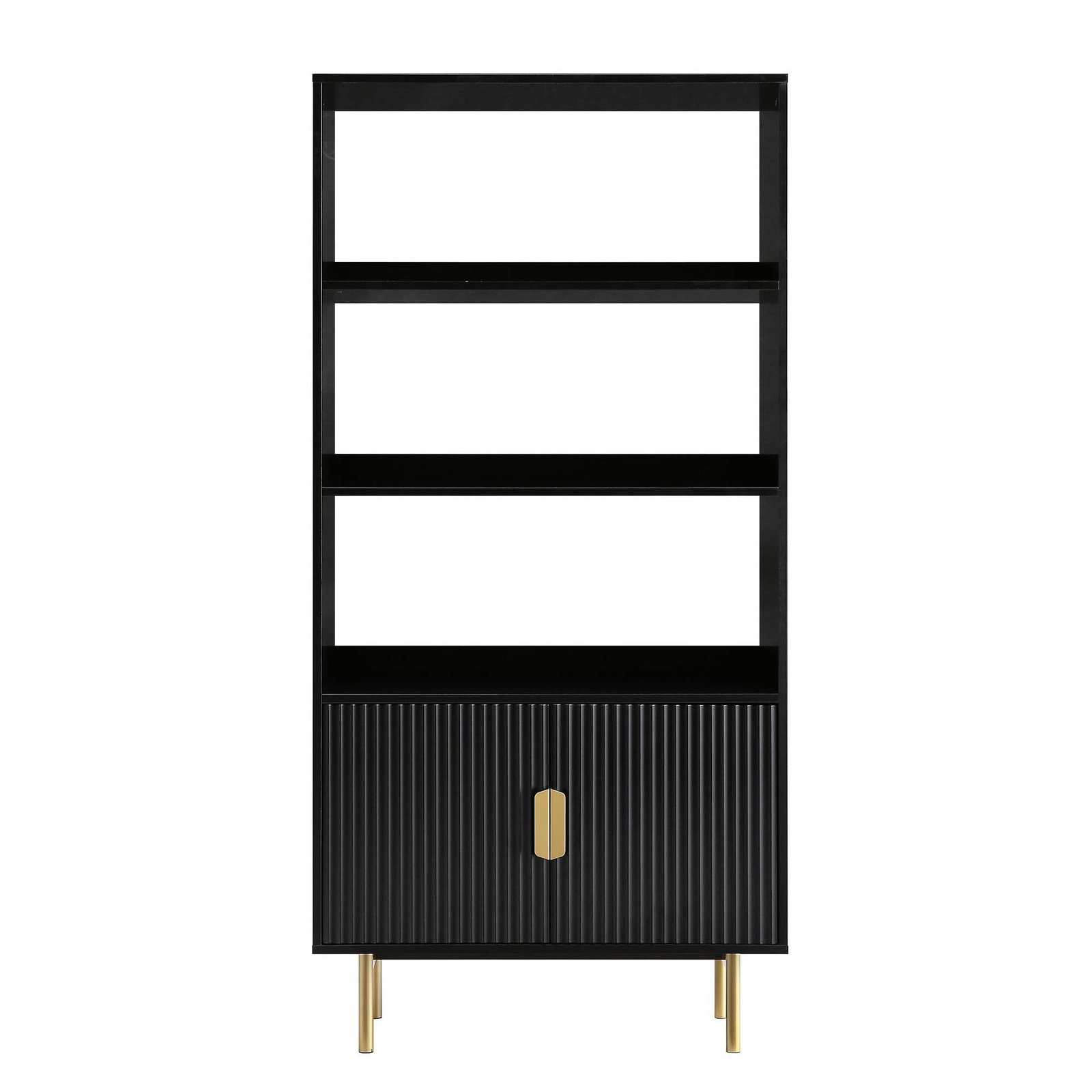 - The bookcase features ridged door surface finished in matte black paint, paired with gold handles on the doors and matching legs.