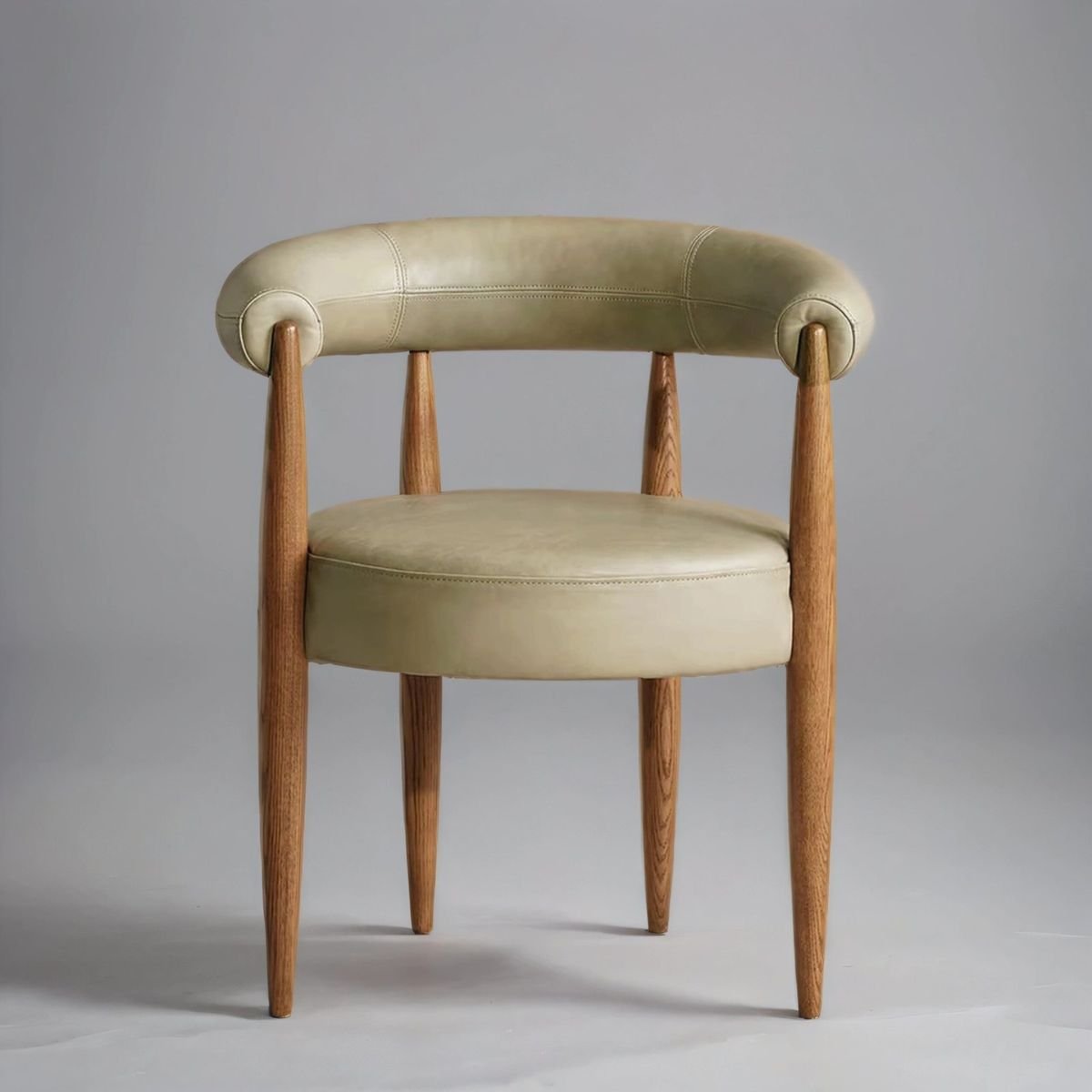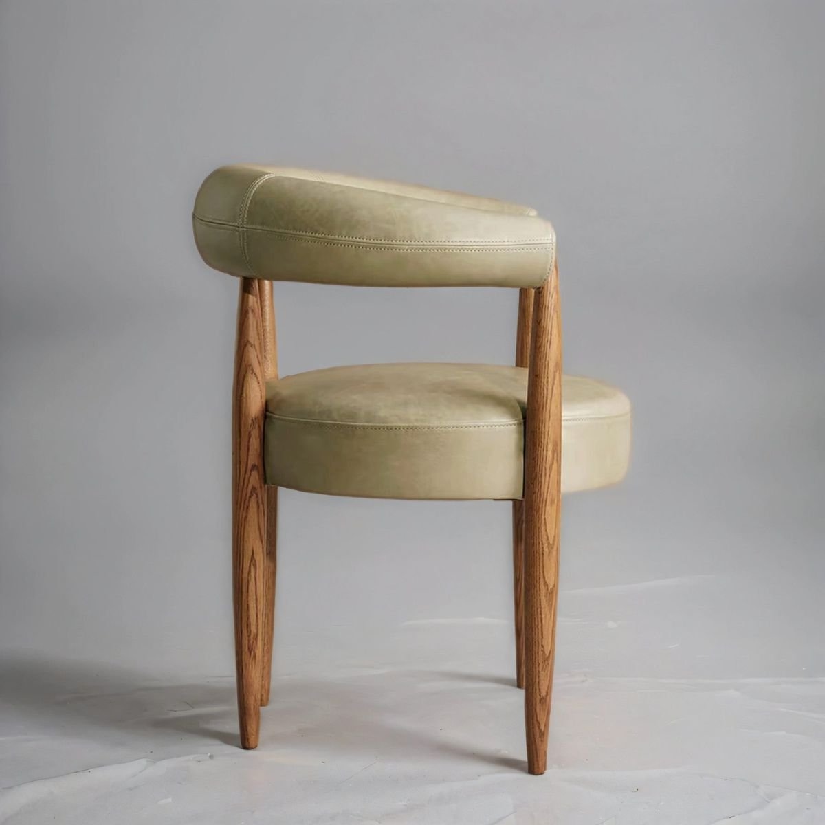 A curved backrest and circular seat are supported by slender spindle legs carved from solid wood, creating the architectural but comfortable silhouette of our Sutton Solid Wood Curved Dining Chair. Both the backrest and padded seat are finished with faux leather upholstery.