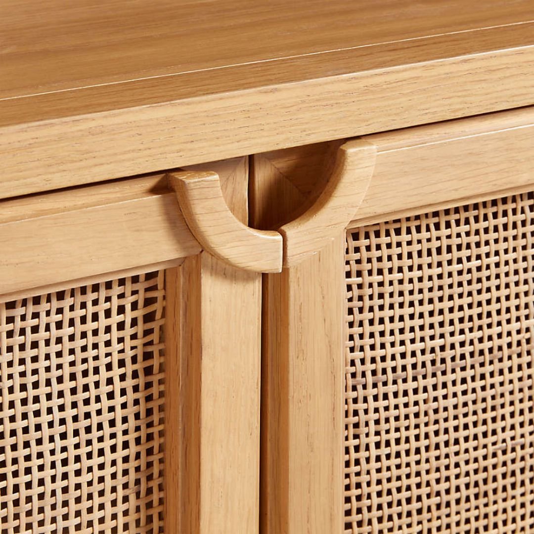 The simple symmetry and airy rattan doors keep our Trident Solid Wood Rattan Storage Bookcase looking fresh and timeless. For a view of fine craftsmanship from several angles, the bookcase’s storage cabinet is wrapped from front to side with a grid pattern made of woven rattan framed in solid wood. Semicircular inset finger pulls dot the cabinet with clever curves, providing access to an interior compartment. On top, two open adjustable shelves provide storage for books, photos, or collectibles. A light rye finish ties it all together, complementing the natural hue of the rattan detailing.