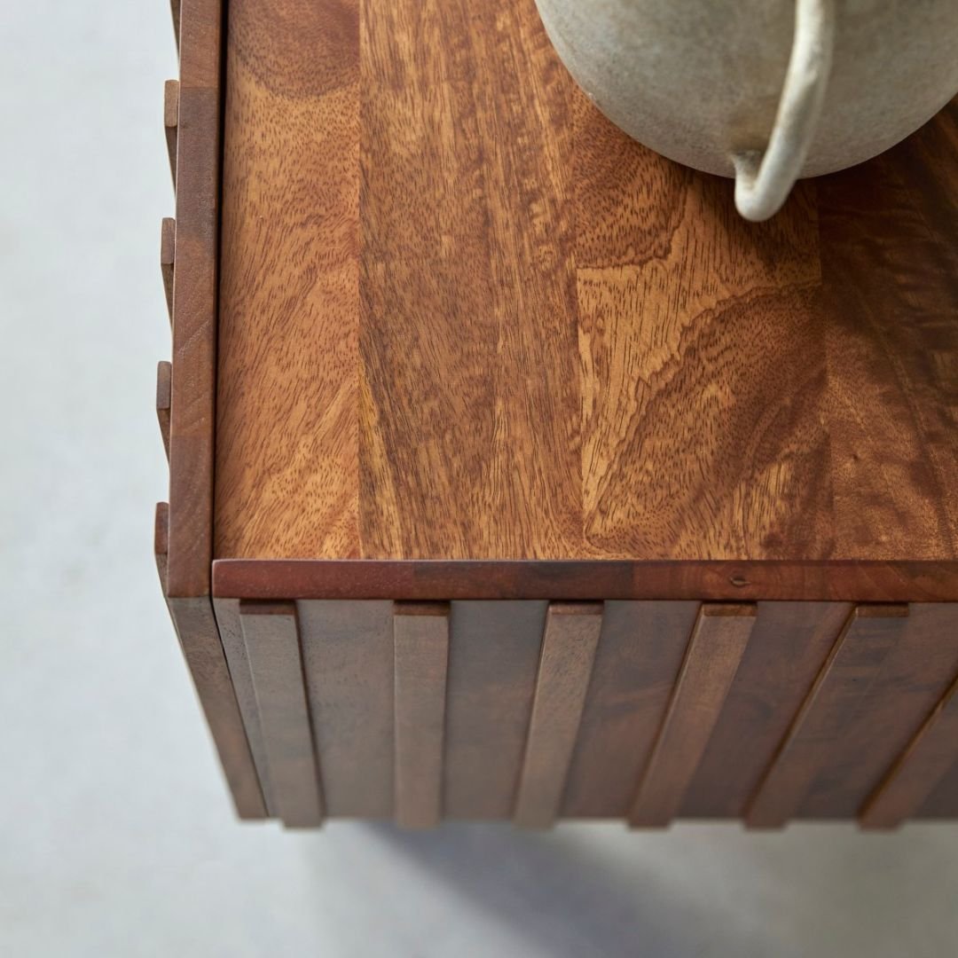 The Palo Solid Wood 140 cm TV Unit is inspired by exotic places. We love its unique charm and the slatted design of the front. Elegant and full of personality, this piece of furniture will enable you to tidy away all your multimedia equipment and related accessories, such as remote controls, gamepads, magazines, etc. Aesthetically pleasing and functional, it will create a warm atmosphere in the living room, dining room or bedroom and can be used as a low sideboard for a very contemporary interior. Crafted from solid wood that has a guarantee that the wood comes from responsibly managed forests, it has an attractive varnished finish.
