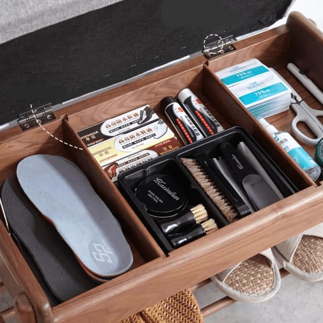 Reserved space for shoe brushes and polishes Lift the soft stool surface, and immediately hide the storage compartment, making it easier to find items. Avoid hallway clutter.